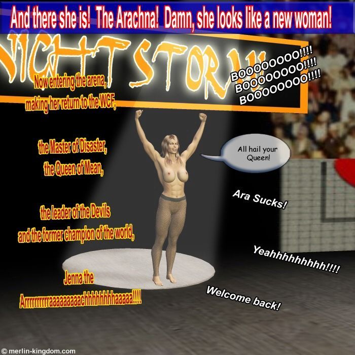 Fans, what a match we have for you tonight on NightStorm!Jenna the Arachna, the leader of the Devils and the former WCF Champ makes her miraculous return to the Federation in a matchup against Razor, the leader of Daughters of Darkness!